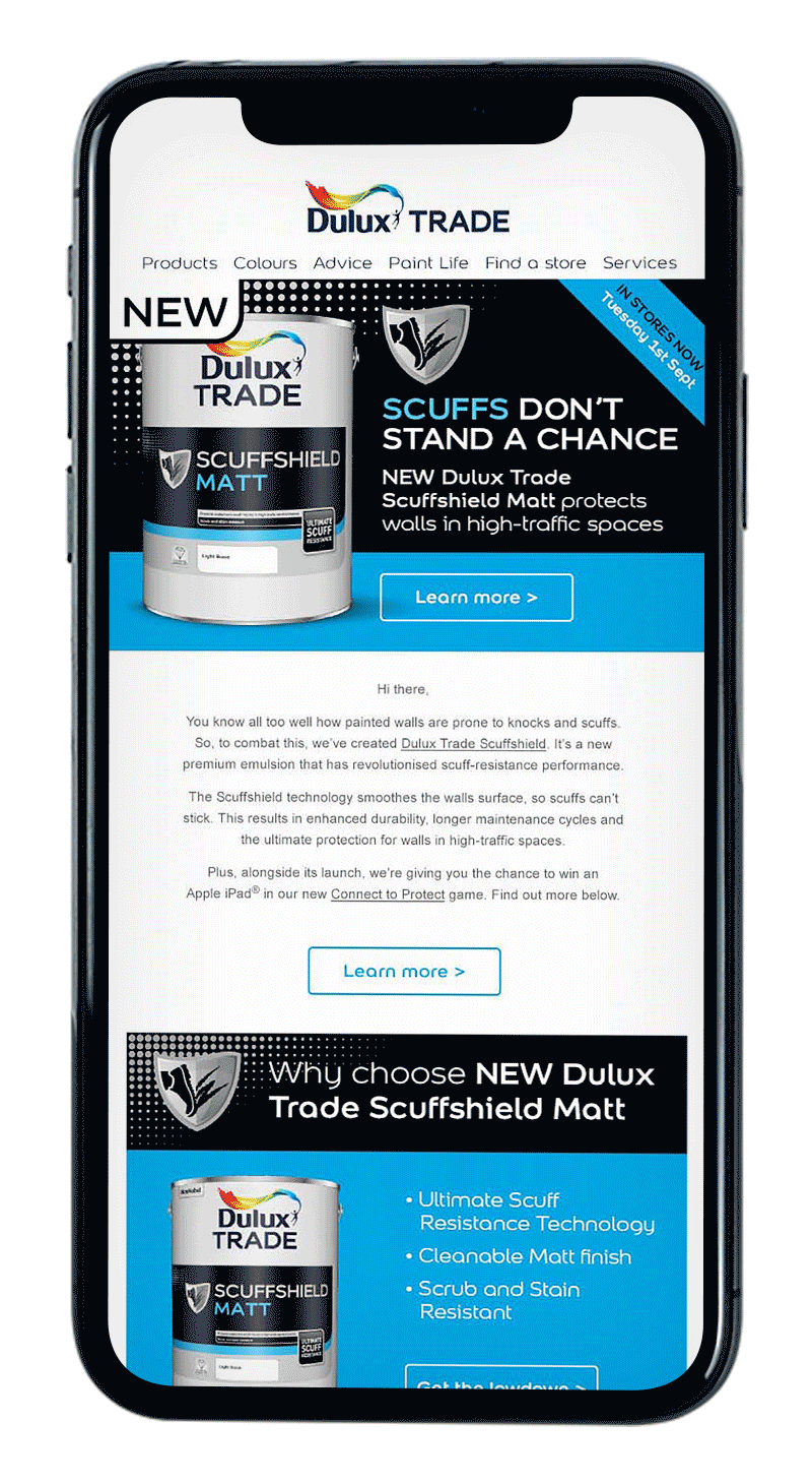 To achieve this, we embarked on a comprehensive marketing campaign utilising various channels, including engaging emails, captivating social media videos, and eye-catching static posts. Through these targeted communications, we aimed to educate our customers about the remarkable features and advantages of Dulux Trade Scuffshield. To elevate the excitement surrounding the launch, we devised an interactive game called 'Connect to Protect' on Drimify. This engaging experience offered participants the opportunity to win an Apple iPad® and a systainer filled with essential decorator supplies. By incorporating gamification into the campaign, we not only increased brand awareness but also fostered a sense of fun and excitement among our audience. The strategic combination of informative emails, compelling social media content, and an interactive game allowed us to effectively convey the unique selling points of Dulux Trade Scuffshield. We successfully engaged our customers, highlighting the product's unrivalled scuff performance and its ability to withstand the demands of high-traffic areas. The launch of Dulux Trade Scuffshield marked a significant milestone in our commitment to delivering exceptional products and experiences to our valued customers. We are proud to introduce this game-changing paint and provide a comprehensive marketing campaign that informs, captivates, and rewards our customers. Join us in celebrating the arrival of Dulux Trade Scuffshield and discover a new standard of durability and scuff resistance.